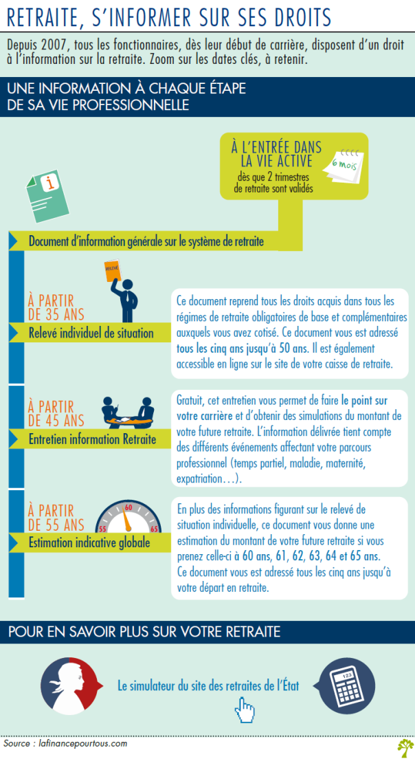 Depuis 2007, tous les fonctionnaires, dès leur début de carrière, disposent d'un droit à l'information sur la retraite. Zoom sur les dates clés à retenir.